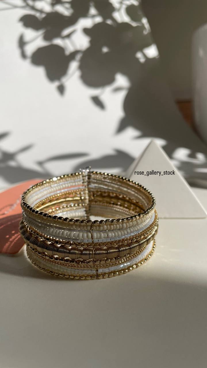 دستبند چند ردیفه بوهو مدل "سپید و زر" | ترکیب مهره و بافت فلزی