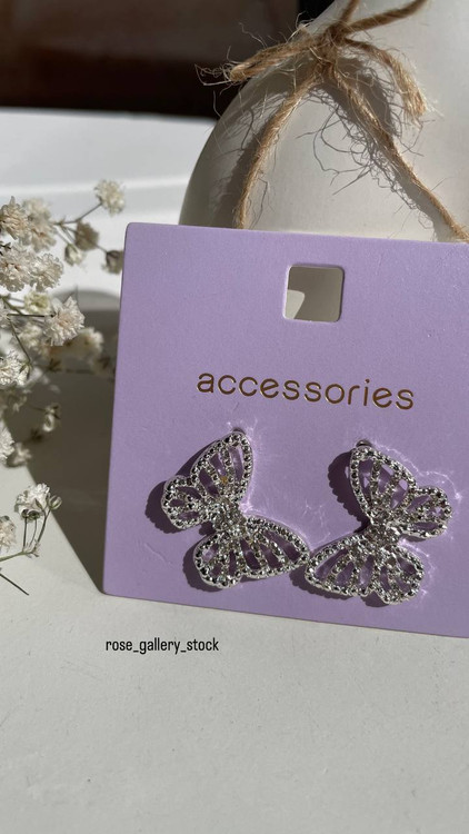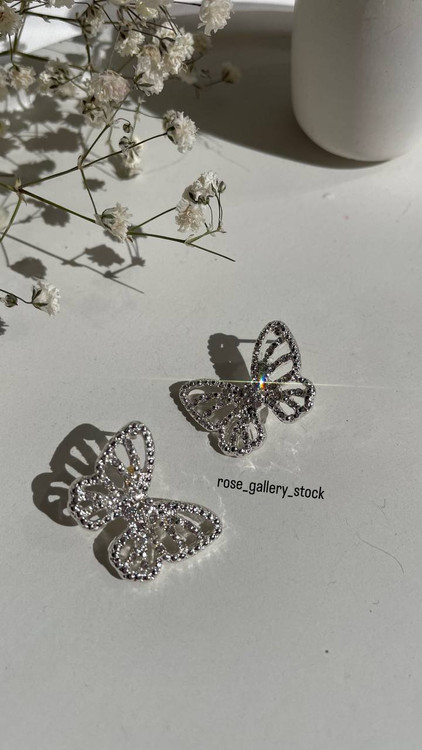 یک جفت گوشواره زیبا به شکل پروانه با طراحی ظریف و درخشان، مناسب برای استایلهای رسمی و روزمره. این گوشوارهها با نگینهای ریز درخشان تزئین شدهاند که جلوهای شیک و خاص به آنها میبخشد.