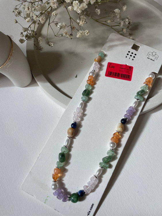 این گردنبند زیبا از برند SIX با استفاده از سنگهای نیمه قیمتی در رنگهای مختلف، شامل فیروزه، یاقوت، گارنت و مروارید ساخته شده است. طراحی خاص و رنگارنگ این گردنبند، آن را به یک اکسسوری بینظیر برای ست کردن با استایلهای مختلف تبدیل میکند. مرواریدها و سنگهای شفاف به این گردنبند جلوهای شیک و مدرن بخشیدهاند.