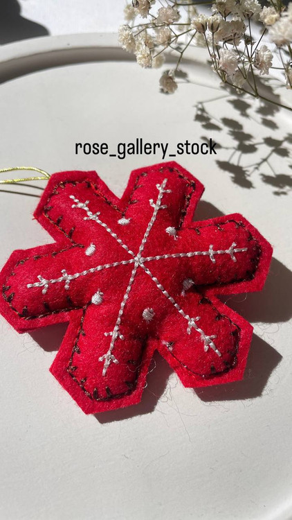 آویز نمدی ستارهای با دوخت برفی سفید، الهامگرفته از حس آرام زمستان. مناسب برای تزئین فضاهای داخلی، آویز درخت کریسمس یا سوغاتهای فصلی.