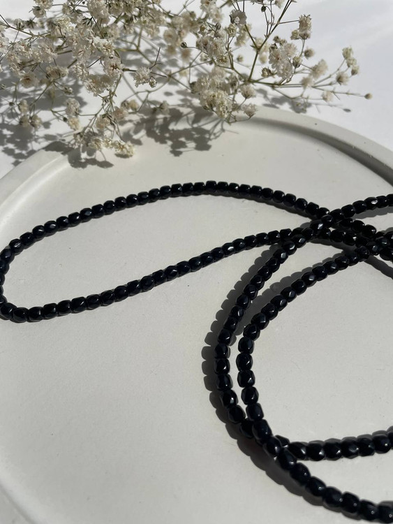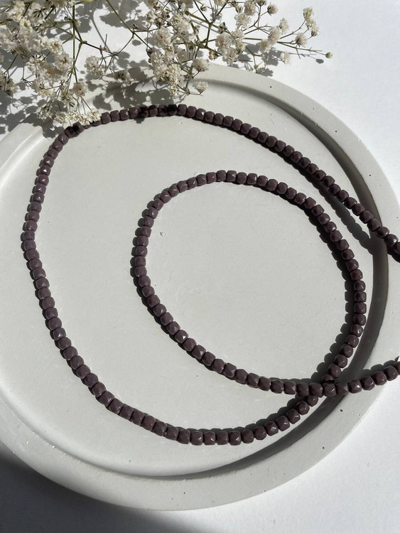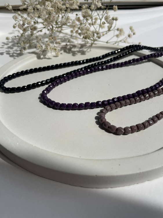 ست گردنبندهای شیک با مهرههای براق در رنگهای مشکی، بنفش و قهوهای خاکی. انتخابی خاص برای استایل روزمره یا لایهلایه با دیگر زیورآلات.