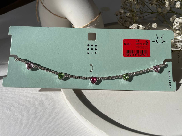 چوکر ظریف و درخشان با نگینهای قلبی صورتی و سبز از برند خوشنام SIX، نمادی از عشق، لطافت و استایل مدرن است. کریستالهای براق این چوکر جلوهای دخترانه و عاشقانه به گردن میبخشند و آن را به انتخابی خاص برای قرارهای عاشقانه، جشنها و هدیههای خاص تبدیل کردهاند.