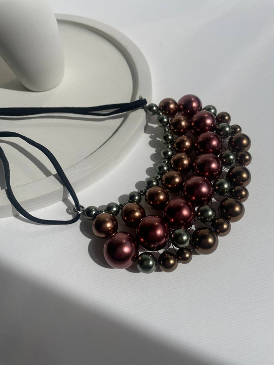 گردنبند “شاین ارث” با ترکیب هنرمندانه مهرههای متالیک در رنگهای شامپاینی، زیتونی و زرشکی طراحی شده است. این قطعه خاص با بند مشکی لطیف، جلوهای مدرن و درخشان به استایل شما میبخشد. مناسب برای مهمانیها، استایلهای بوهمین و اکسسوریهای روزمره.