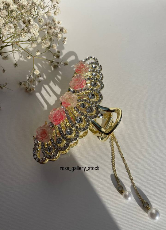 این گیره موی لوکس با طراحی گلهای رز صورتی، نگینهای درخشان و زنجیر آویز با مروارید، انتخابی عالی برای مهمانی، عروسی و استایلهای زنانه خاص است. فلز طلایی رنگ آن در کنار تزئینات ظریف، جلوهای سلطنتی به موهای شما میبخشد.