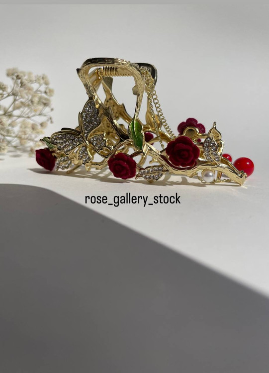 کلیپی فلزی طلایی “رز جادویی” با طراحی رمانتیک شامل گلهای رز مخملی قرمز، پروانههای نگیندار، شاخههای طلایی و زنجیرهای آویز با مهرههای قرمز، انتخابی فوقالعاده برای استایلی زنانه، عاشقانه و متفاوت است. مناسب برای مهمانیها، مجالس یا عکسهای خاص.