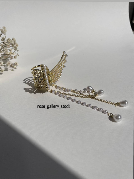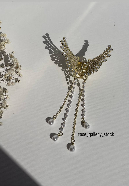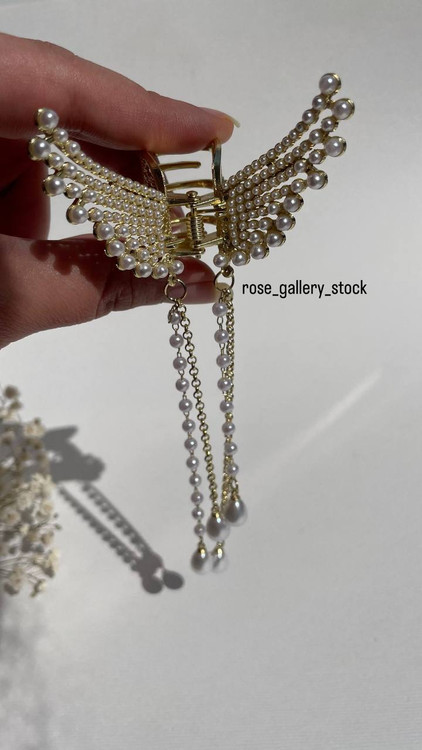 این گیره موی زیبا با طراحی الهامگرفته از بالهای فرشته، جلوهای لطیف و زنانه به استایل شما میبخشد. تزیینشده با ردیفهای منظم از مرواریدهای براق و زنجیرهای آویزان، این گیره انتخابی ایدهآل برای مراسم خاص، عکاسی و مهمانیها است.