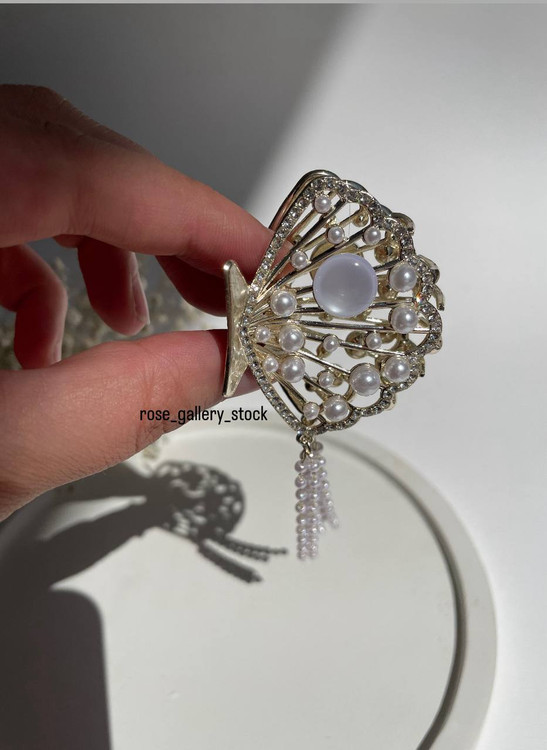 کلیپس موی صدفی با طراحی خاص و لوکس، ترکیبی زیبا از مرواریدهای براق و فلز طلایی است که جلوهای بسیار شیک و متفاوت به استایل شما میبخشد. آویزهای مرواریدی از کلیپس آویزان شدهاند تا با هر حرکت مو، ظرافتی چشمگیر ایجاد کنند. این ست برای مجالس، مهمانیها یا حتی ترکیب با استایلهای روزمره مینیمال بسیار مناسب است.