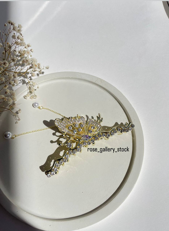 این کلیپس مو با طراحی منحصربهفرد و الهامگرفته از تاج سلطنتی و پروانهای درخشان، جلوهای خاص به موهای شما میبخشد. نگینهای براق و زنجیر مرواریدی این اکسسوری را به انتخابی شایسته برای مجالس، عروسیها یا حتی استایلهای کلاسیک و خاص تبدیل کرده است. ساختار محکم کلیپس باعث میشود که بهخوبی روی موها بنشیند و استایلتان را تکمیل کند.