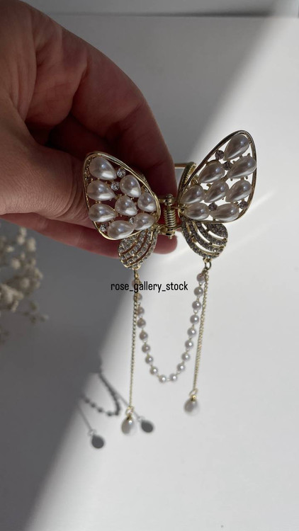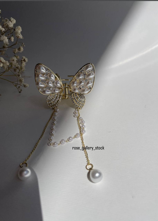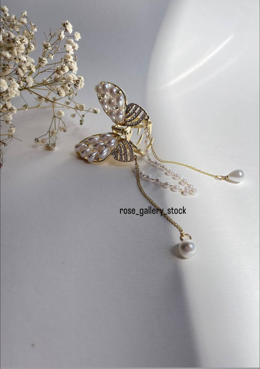 گیره موی طرح پروانه با تزئین مرواریدهای درخشان و کریستالهای ظریف، انتخابی ایدهآل برای مجالس، مهمانیها و استفاده روزمره شیک. طراحی خاص این گیره به شکل پروانه با زنجیر آویز مرواریدی، جلوهای خاص و ظریف به استایل شما میبخشد.