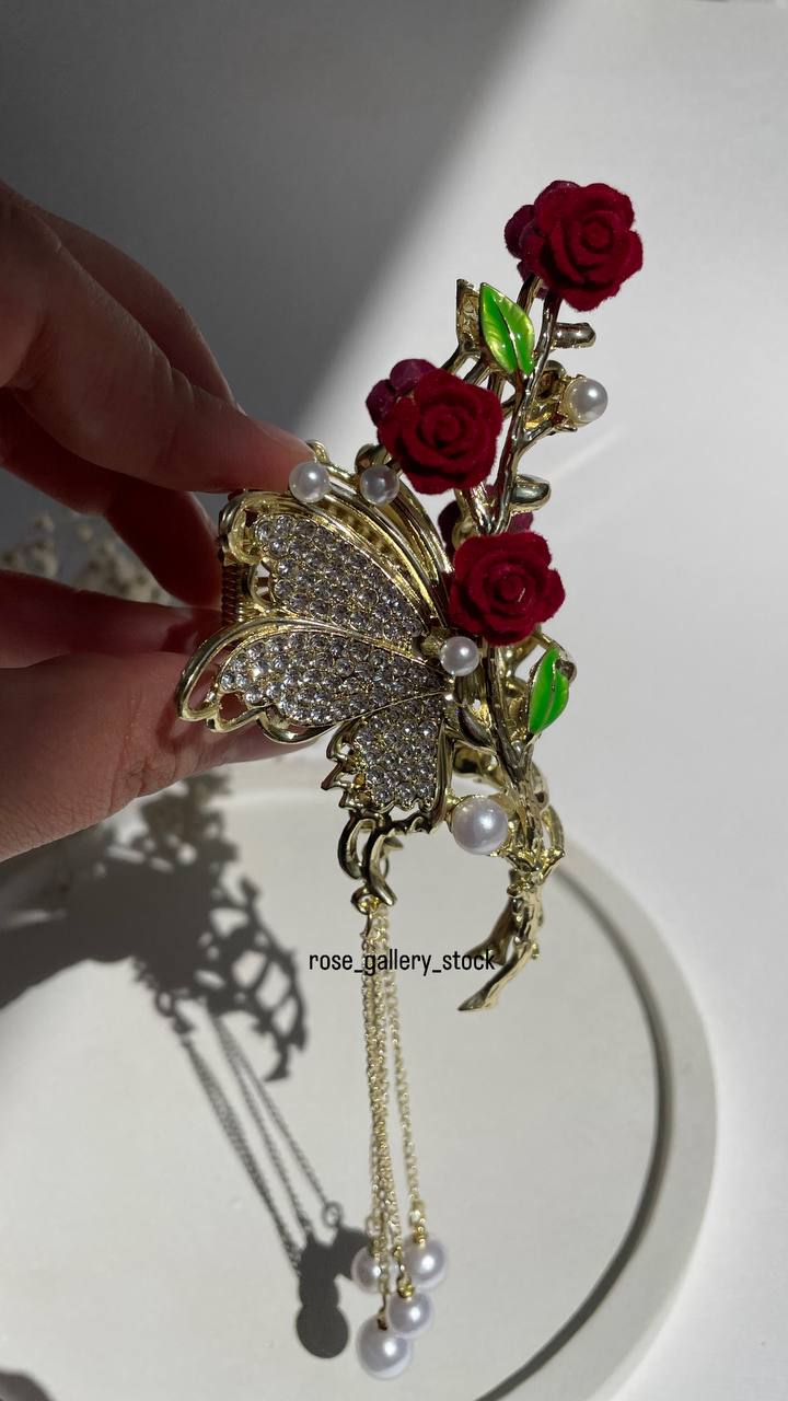 کلیپس پروانهای گلدار مخملی با آویز مروارید