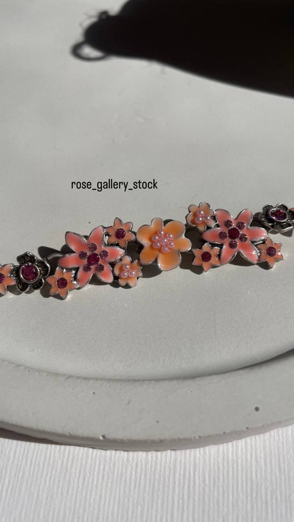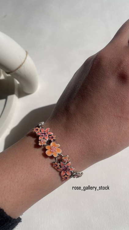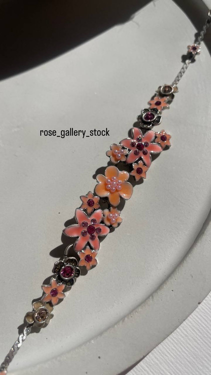 این دستبند زیبا با طراحی الهامگرفته از شکوفههای بهاری، ترکیبی از رنگهای ملایم صورتی و نارنجی دارد که جلوهای لطیف و دخترانه به استایل شما میبخشد. نگینهای درخشان و فلز نقرهای آن، زیبایی خاصی ایجاد کرده و مناسب برای استایلهای روزمره و مجلسی است.