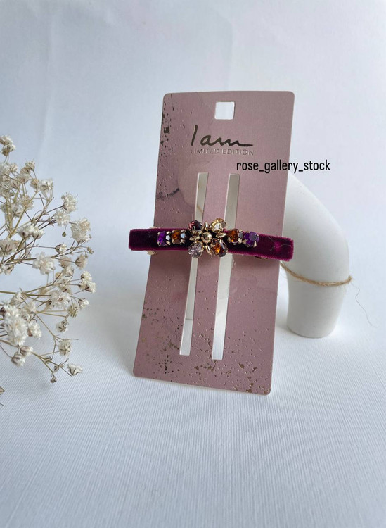 این گیره موی شیک با بند مخملی بنفش تیره و تزئین گل نگینکاری شده، ترکیبی از لطافت و درخشش را به استایل شما میافزاید. مناسب برای استفاده در مهمانیها، مجالس رسمی یا حتی برای جلوهای خاص در استایل روزمره.