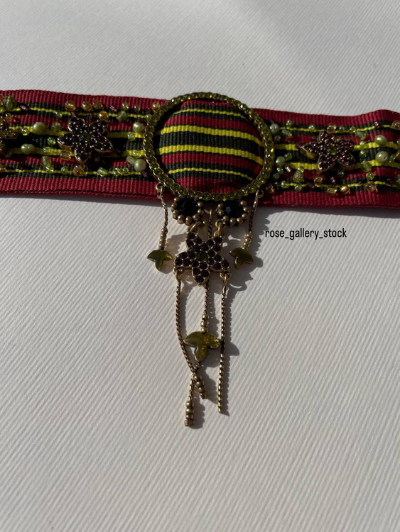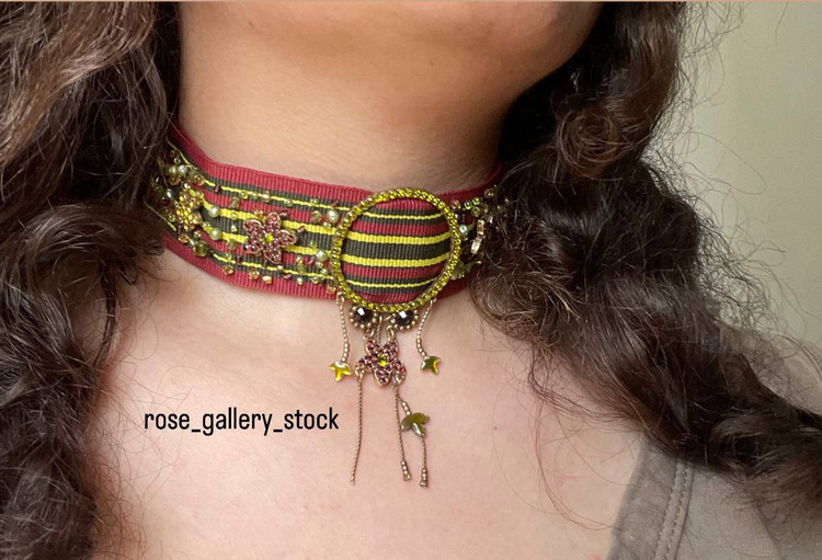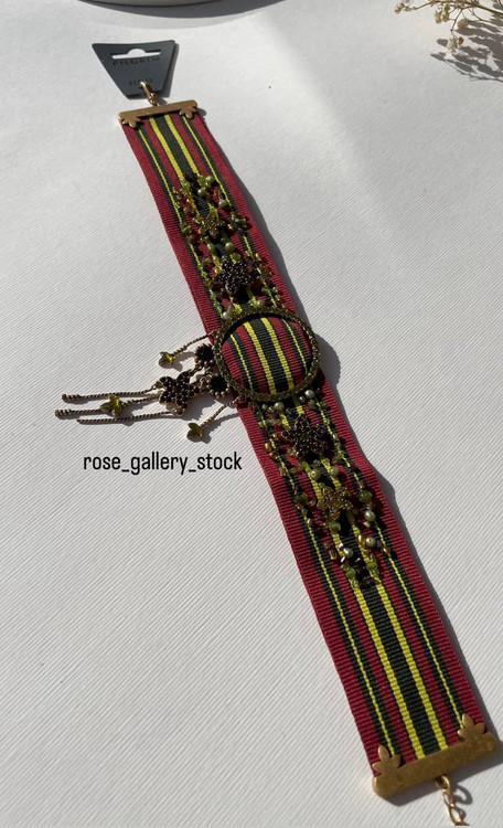 چوکر پارچهای برند Pilgrim با طراحی خاص و هنری، ترکیبی از پارچه مخملی قرمز و سبز با جزئیات دستدوز، مرواریدهای ریز و نگینهای براق است که جلوهای منحصربهفرد و چشمگیر به استایل شما میبخشد. آویزهای ظریف با فرم ستاره، هلال و گل، این گردنبند را به انتخابی عالی برای مهمانیها، فشن شوها و استایلهای خاص تبدیل کرده است. این محصول اورجینال و بدون نیکل بوده و برای پوستهای حساس نیز مناسب است.