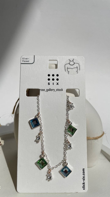 گردنبند ظریف و مدرن از برند SIX با طراحی خاص و چشمگیر. زنجیر نقرهای آبکاریشده با پلاکهای مربعی سبز و آبی و آویزهای کوچک کریستالی، مناسب برای استایلهای روزمره و مهمانی. این گردنبند انتخابی ایدهآل برای افزودن رنگ و درخشش به استایل شماست.