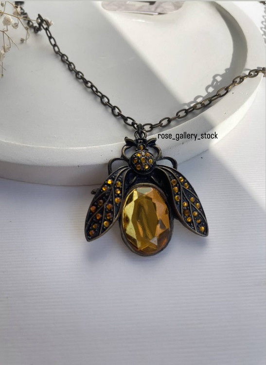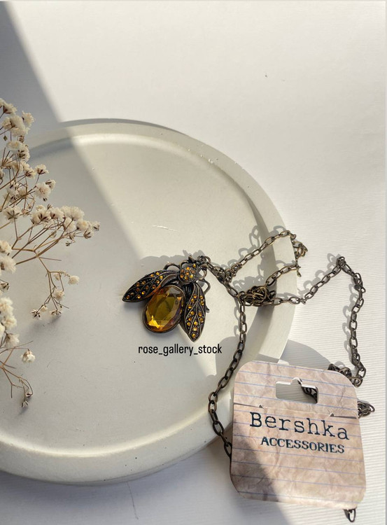 گردنبند شیک و خاص از برند Bershka با آویز زنبور طراحی شده با جزئیات ظریف و سنگ کریستالی زرد براق. این گردنبند انتخابی عالی برای استایلهای خاص و متفاوت است. مناسب برای استفاده روزمره یا ست کردن با استایلهای خاص مهمانی.