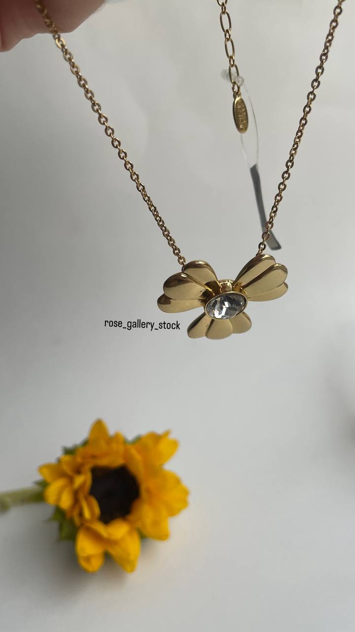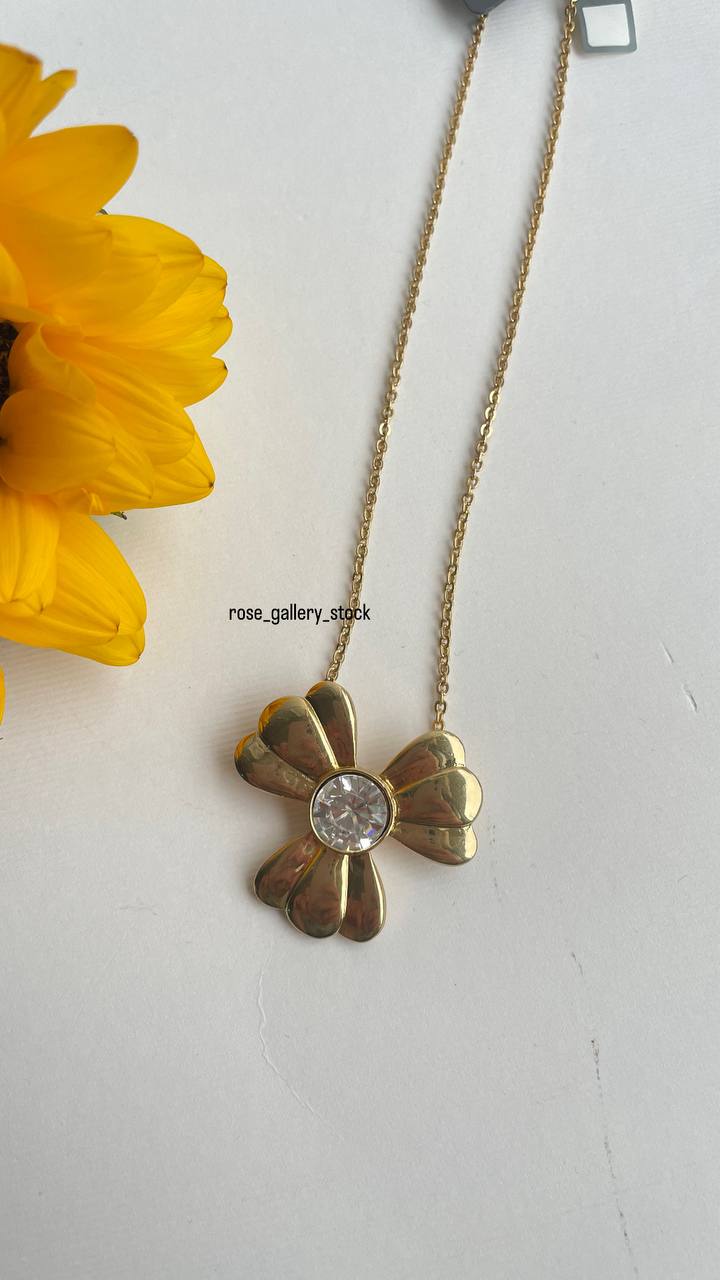 جنس: استیل ضد زنگ با روکش طلایی طرح: گل چهارپر با نگین براق طول زنجیر: حدودی 45 سانتیمتر ضد حساسیت مناسب برای استایل روزمره و رسمی نیاز به مراقبت دارد