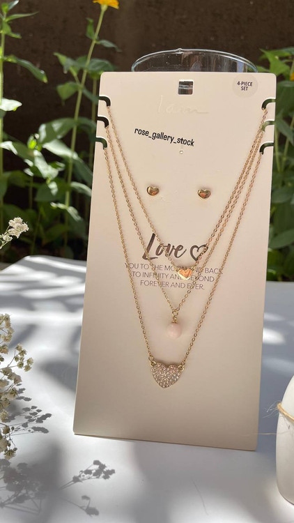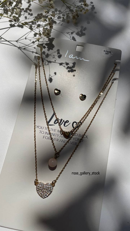 این ست شیک و ظریف شامل دو گردنبند لایهای، یک جفت گوشواره میخی قلبی و یک آویز سنگ صورتی است. ترکیب طلایی با نگینهای درخشان و سنگ رز کوارتز، جلوهای رمانتیک و خاص به استایل شما میبخشد. مناسب برای استفاده روزمره، قرارهای عاشقانه و هدیه دادن به عزیزان.