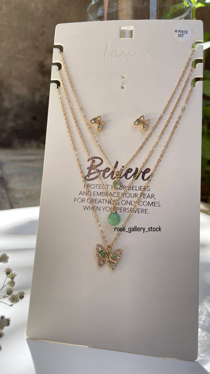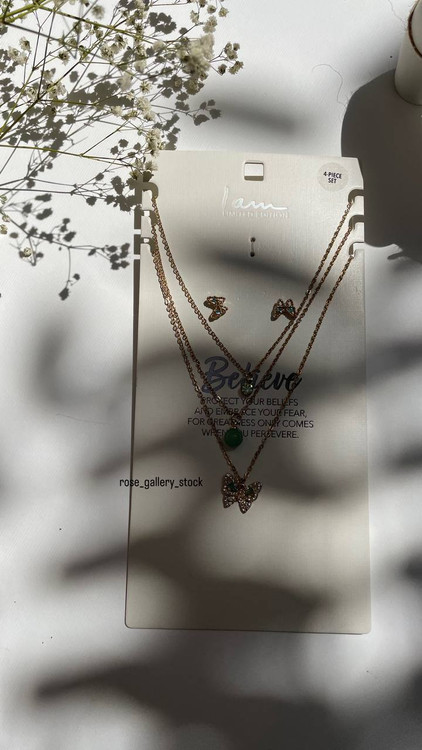 این ست ظریف و خاص شامل دو گردنبند لایهای، یک جفت گوشواره میخی پروانهای و آویز سنگ سبز است. طراحی پروانه با نگینهای درخشان و ترکیب طلایی، جلوهای لطیف و زنانه به استایل شما میدهد. انتخابی عالی برای استفاده روزمره یا هدیهای خاص برای عزیزانتان.