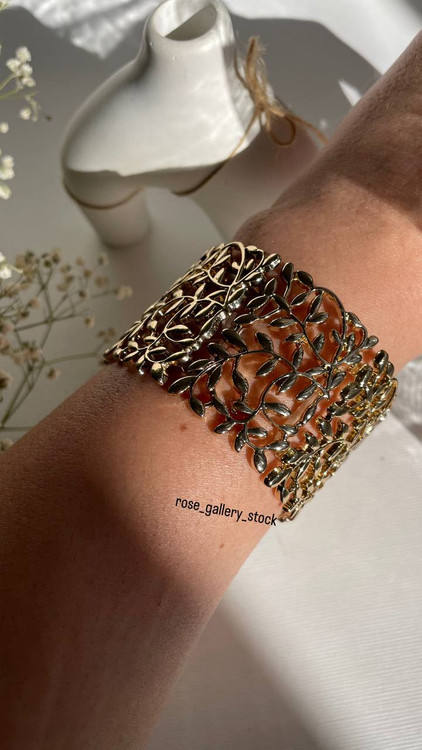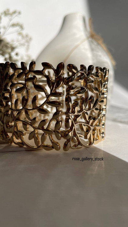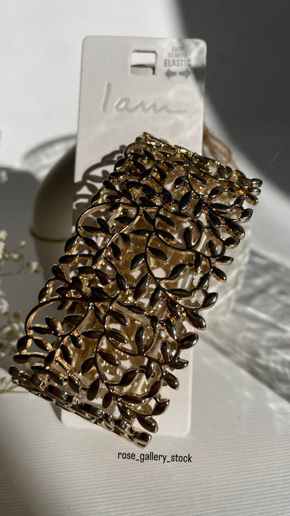 این دستبند پهن و خاص با طراحی الهام گرفته از شاخه و برگهای طلایی، انتخابی ایدهآل برای استایلهای خاص و رسمی است. به دلیل حالت کشی (elastic) به راحتی روی دست قرار میگیرد و برای هر سایزی مناسب است.