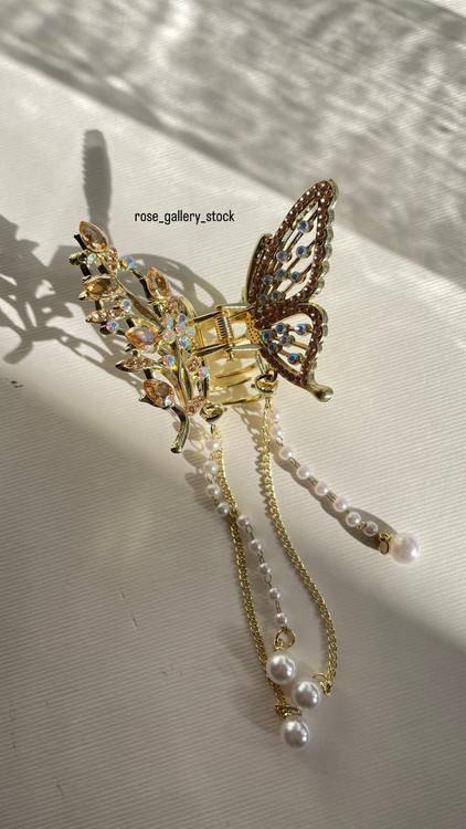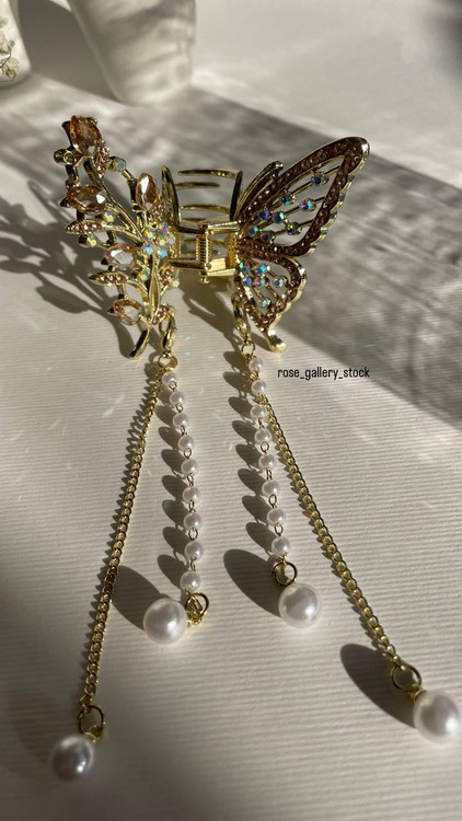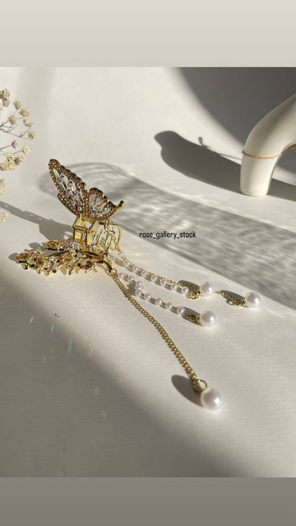 کلیپس پروانهای طلایی با طراحی ظریف و نگینهای براق، جلوهای لاکچری و زنانه به استایل شما میدهد. وجود آویزهای زنجیری و مرواریدی، این اکسسوری را به انتخابی ایدهآل برای مجالس، عروسیها و مهمانیها تبدیل کرده است. طراحی پروانهای نماد زیبایی و لطافت بوده و مرواریدها حس کلاسیک و شیک به آن افزودهاند.