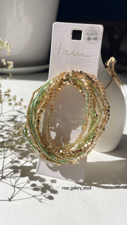 این ست دستبند مهرهای شامل چند ردیف دستبند با مهرههای ریز در رنگهای طلایی، سبز و شفاف است. طراحی سبک و رنگهای هماهنگ آن باعث میشود به راحتی با هر استایلی ست شود. این دستبندها قابل استفاده به صورت جداگانه یا همراه با هم هستند و جلوهای شیک، دخترانه و مدرن به دستان شما میبخشند.