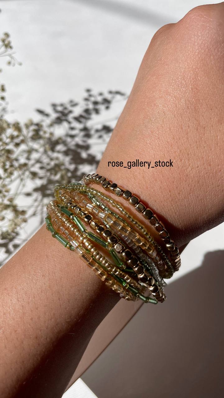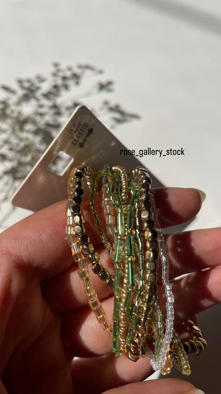 این ست دستبند مهرهای شامل چند ردیف دستبند با مهرههای ریز در رنگهای طلایی، سبز و شفاف است. طراحی سبک و رنگهای هماهنگ آن باعث میشود به راحتی با هر استایلی ست شود. این دستبندها قابل استفاده به صورت جداگانه یا همراه با هم هستند و جلوهای شیک، دخترانه و مدرن به دستان شما میبخشند.