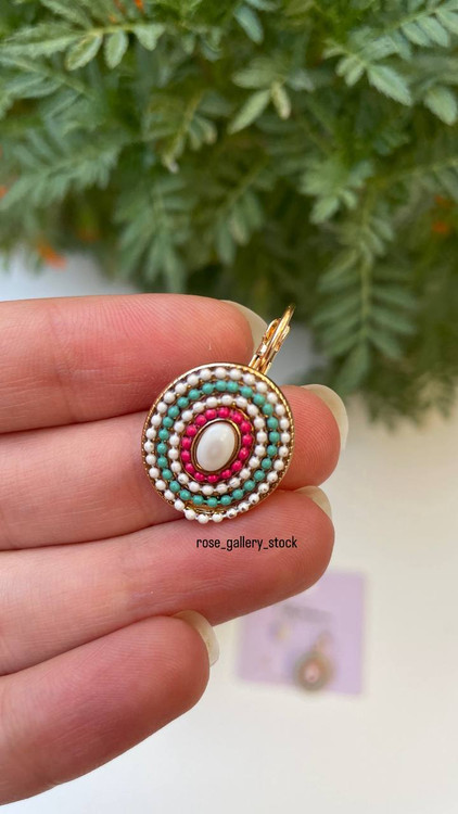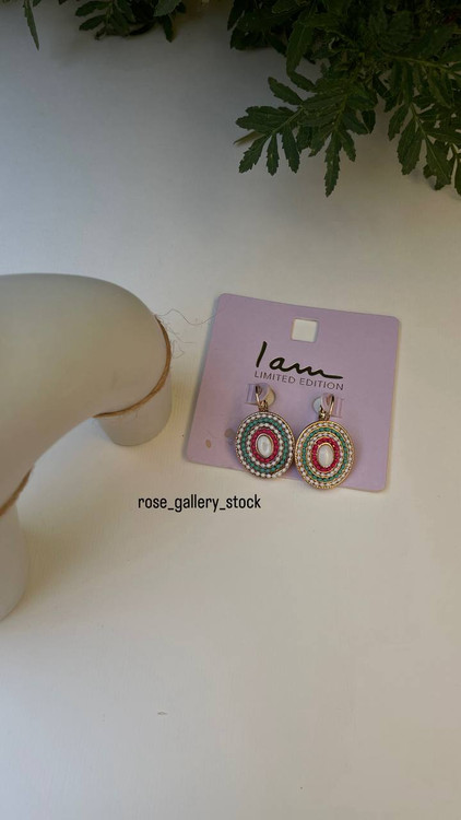 این گوشواره آویزی خاص با طراحی بیضی شکل و ترکیب رنگهای شاد و جذاب، استایلی متفاوت و چشمگیر به شما میبخشد. سنگ مرکزی سفید در کنار ردیفهای رنگی فیروزهای، قرمز و طلایی، جلوهای هنری و خاص ایجاد کرده است. انتخابی عالی برای استفاده روزمره و همچنین استایلهای مهمانی و خاص.