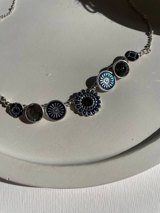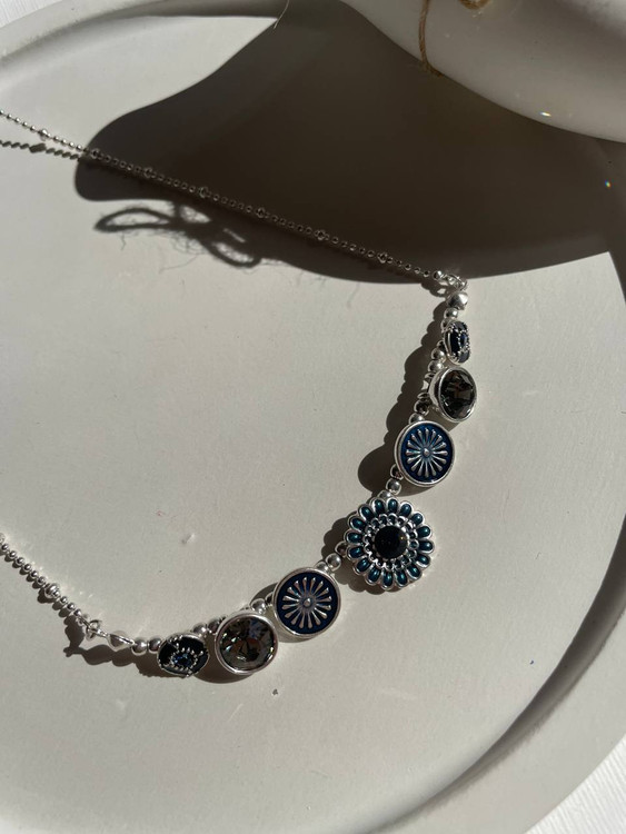 این گردنبند زیبا با ترکیب طراحی گل و اشکال هندسی، جلوهای خاص و منحصربهفرد دارد. رنگبندی نقرهای و آبی تیره، به آن ظاهری کلاسیک و شیک میبخشد. مناسب برای استفاده روزمره و مهمانیها بوده و به راحتی با استایلهای مختلف ست میشود