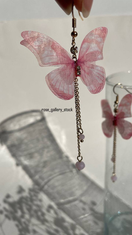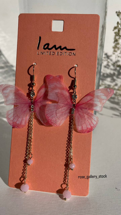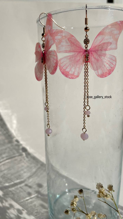 این گوشواره زیبا با طراحی پروانهای و رنگ صورتی ملایم، جلوهای دخترانه و رمانتیک به استایل شما میبخشد. ترکیب بالهای پروانه از جنس حریر سبک و زنجیرهای آویزی با مهرههای صورتی، آن را به گزینهای خاص برای مهمانیها، دورهمیها و استایل روزانه تبدیل کرده است.