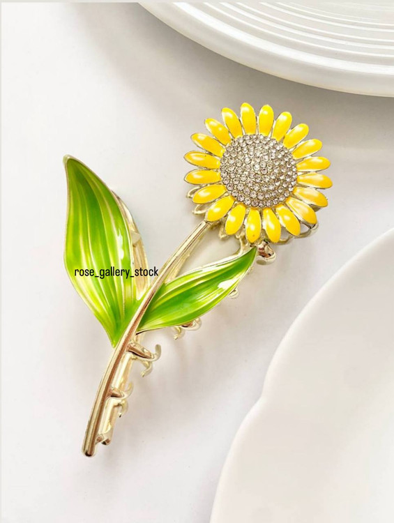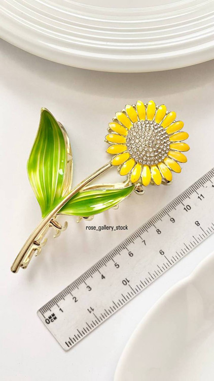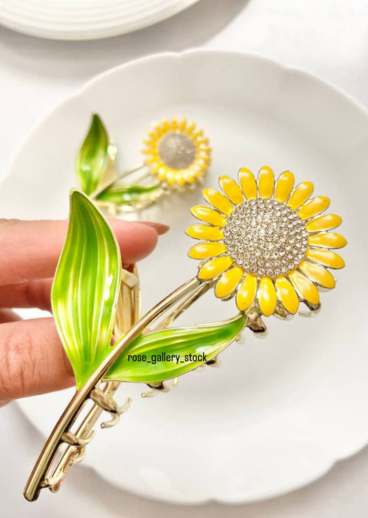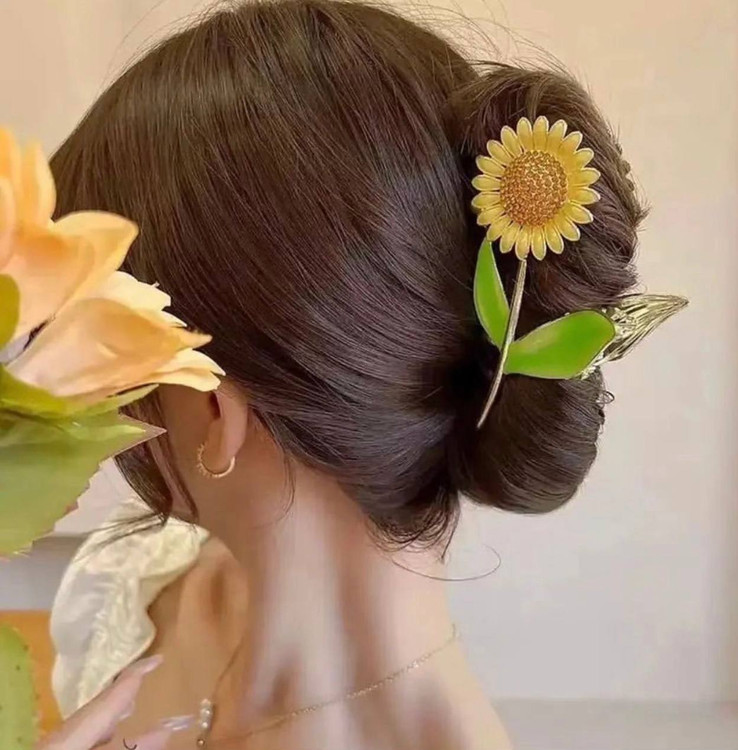 کلیپس فلزی طرح گل آفتابگردان، یک اکسسوری موی خاص و چشمنواز است که استایل شما را کامل میکند. این کلیپس محکم و سبک، بهخوبی روی مو قرار میگیرد و بدون لغزش، حالت شینیون یا موی جمع را حفظ میکند. طراحی گل آفتابگردان با برگهای سبز براق، جلوهای طبیعی و شاد به موها میدهد و برای مجالس، عروسیها یا استفاده روزمره بسیار مناسب است.