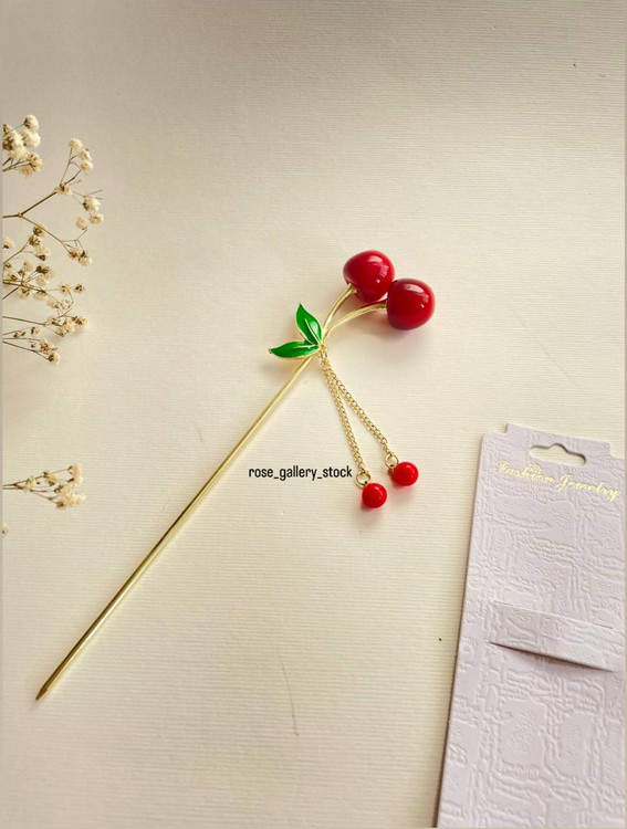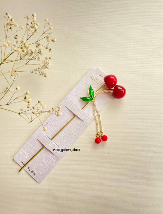 این سنجاق موی زیبا با طراحی فانتزی گیلاس، انتخابی خاص برای استایلهای دخترانه و سنتی است. ترکیب رنگ قرمز براق با برگ سبز و زنجیر طلایی، جلوهای چشمنواز و لطیف ایجاد کرده و مناسب استفاده روزمره یا مهمانیهاست. این محصول میتواند بهعنوان اکسسوری تزئینی برای موهای باز یا شینیون نیز استفاده شود.