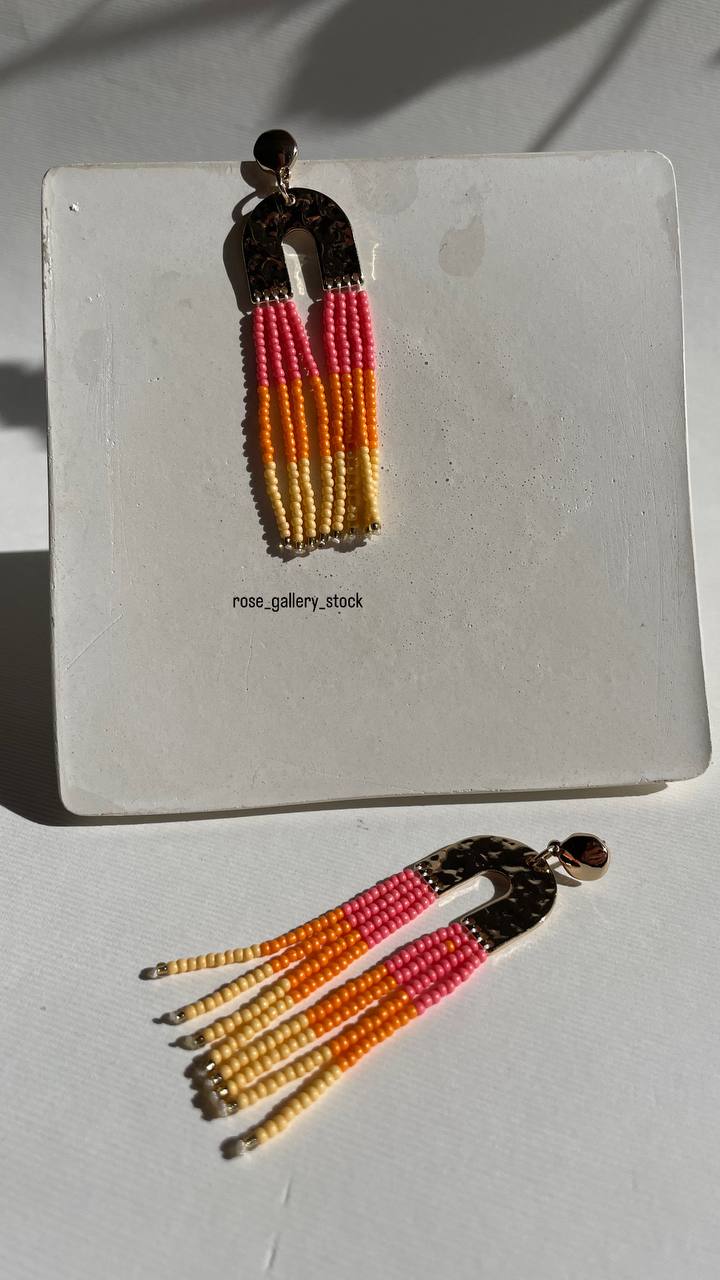 طیف رنگی این گوشواره شامل رنگهای گرم صورتی، نارنجی و کرم است که به صورت ریشریش (Tassel) آویزان شده و با هر حرکت سر، جلوهای پویا و چشمنواز ایجاد میکنند. این گوشوارهها بسیار سبک هستند و برای استفاده طولانیمدت در مهمانیها، دورهمیهای دوستانه یا ست کردن با لباسهای تابستانی و ساحلی فوقالعادهاند.