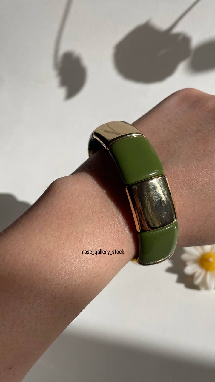 این دستبند منحصربهفرد، تعریفی جدید از اکسسوریهای مدرن و جسورانه است. طراحی آن به سبک Tila/Block بوده که از قطعات مکعبی و تخت با لبههای نرم تشکیل شده است. تضاد رنگی میان سبز زیتونی مات و قطعات طلایی با انعکاس آینهای، جلوهای فوقالعاده لوکس و چشمگیر به مچ دست میبخشد. ساختار این دستبند به صورت کشی دوتایی پنهان است که علاوه بر دوام بالا، اجازه میدهد به راحتی با فرم مچ دست شما همشکل شود. این قطعه برای کسانی که به دنبال اکسسوریهای "Statement" (تاثیرگذار و شاخص) هستند، انتخابی بینظیر است.