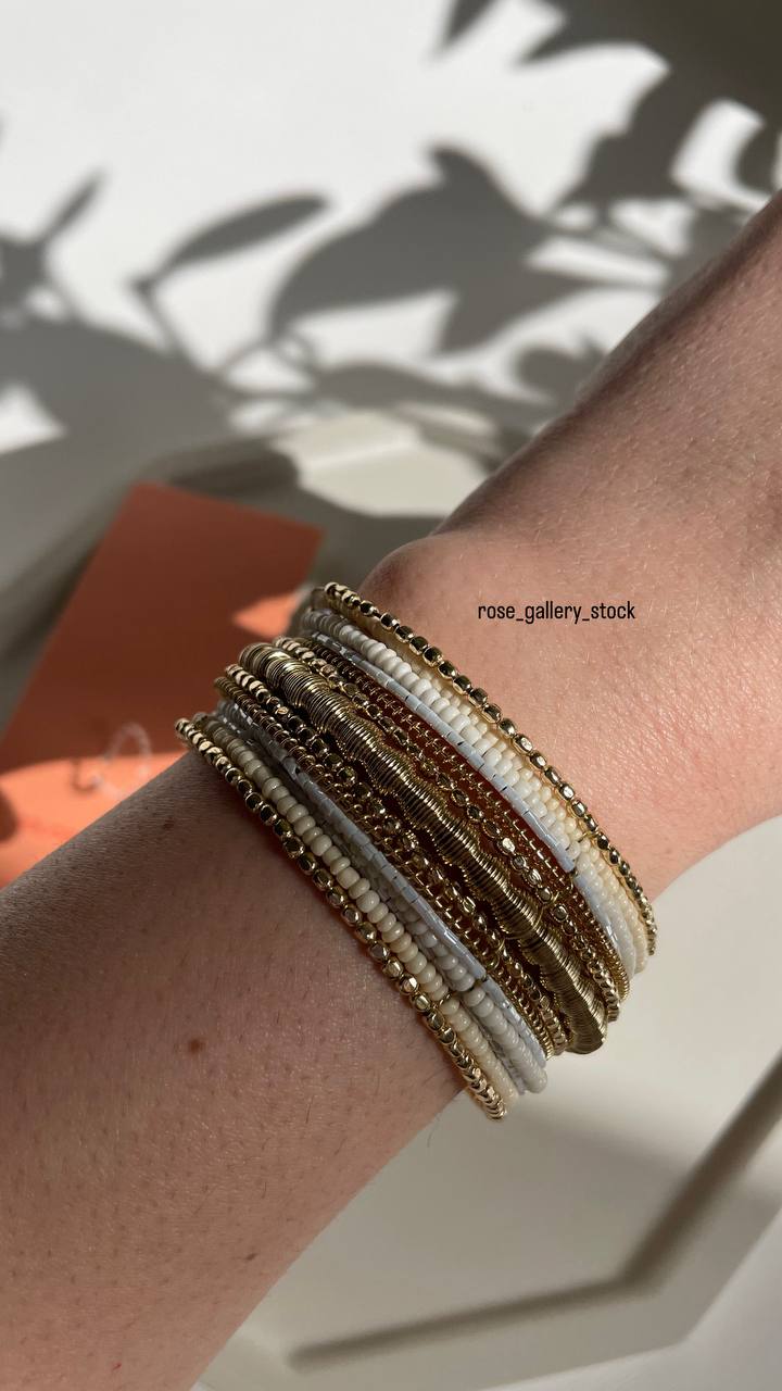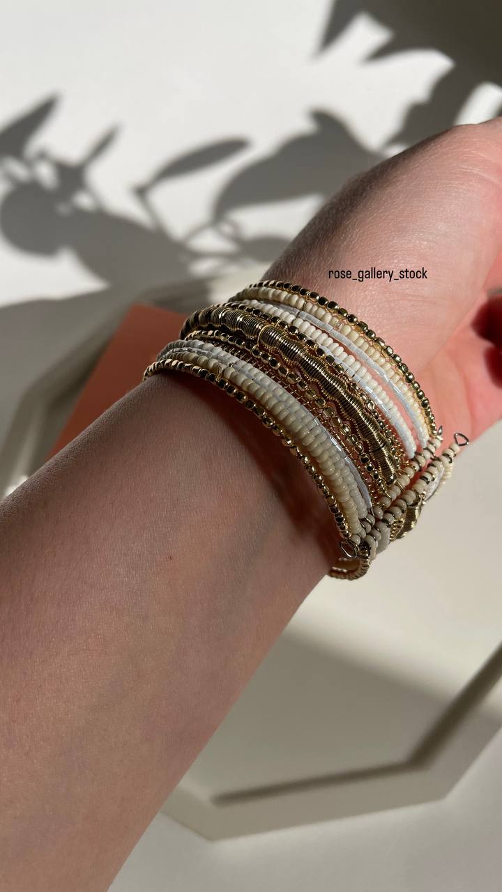 این دستبند زیبا، نمادی از ظرافت و هنر دست در استایل بوهو (Boho) است. طراحی این کار به گونهای است که با بستن یک قفل، ظاهر چندین دستبند ظریف و هماهنگ را روی مچ خود خواهید داشت. ترکیب رنگهای کرم، سفید و طلایی، درخششی ملایم و گرم به دستان شما میبخشد که هم با استایلهای روزمره و هم با لباسهای نیمهرسمی به زیبایی ست میشود.