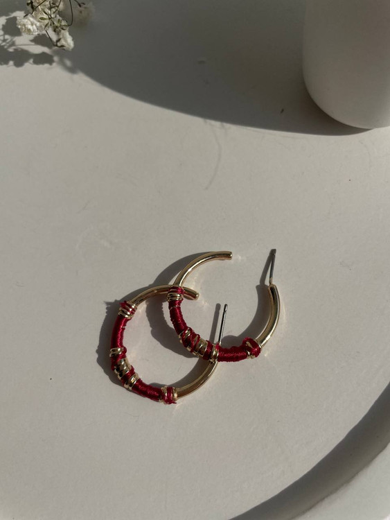 این ست زیبا شامل دو جفت گوشواره و یک پیرسینگ طلایی است که ترکیبی از طراحی مینیمال و دستساز را ارائه میدهد. گوشوارههای حلقهای با روکش طلایی و تزئین نخ قرمز، ظاهری خاص و شیک دارند. همچنین، پیرسینگ برگ طلایی و گوشواره میخی با سنگ رزگلد، این ست را کامل کرده و مناسب استفاده روزمره و مجالس میکند.