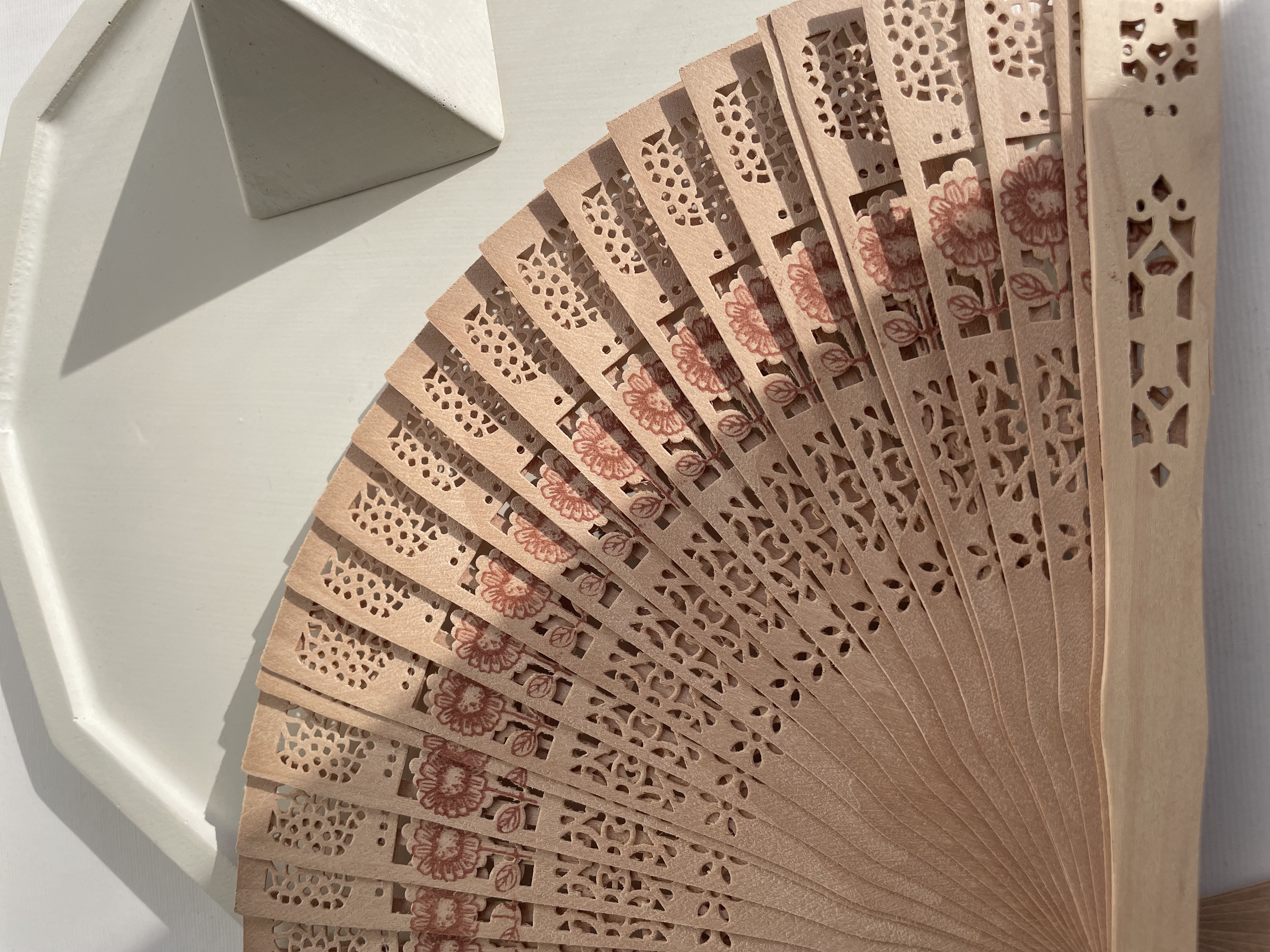 بادبزن چوبی طرح صندل با حکاکی مشبک و نقش گل
